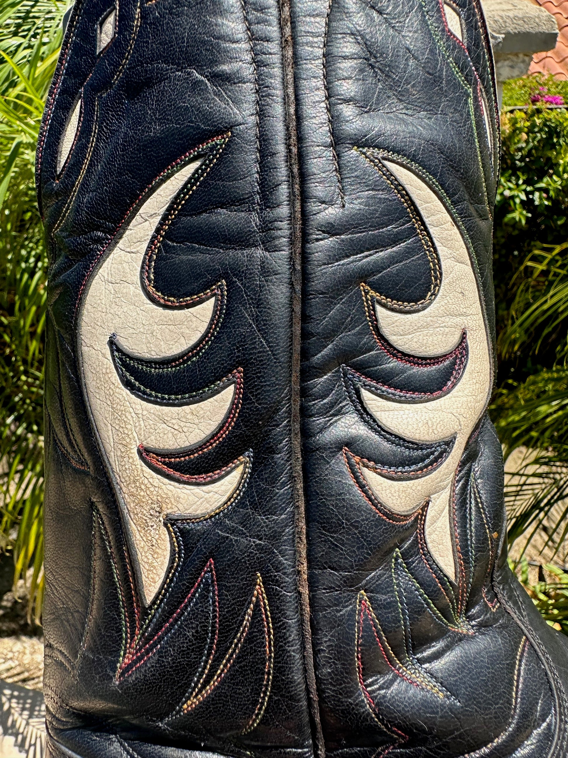 1940's Justin Vintage Cowboy Boots 8.5 D. Rainbow variegated stitching on the shafts with inlay. Handmade. Collectible and rare. They belong on a shelf but are wearable!!