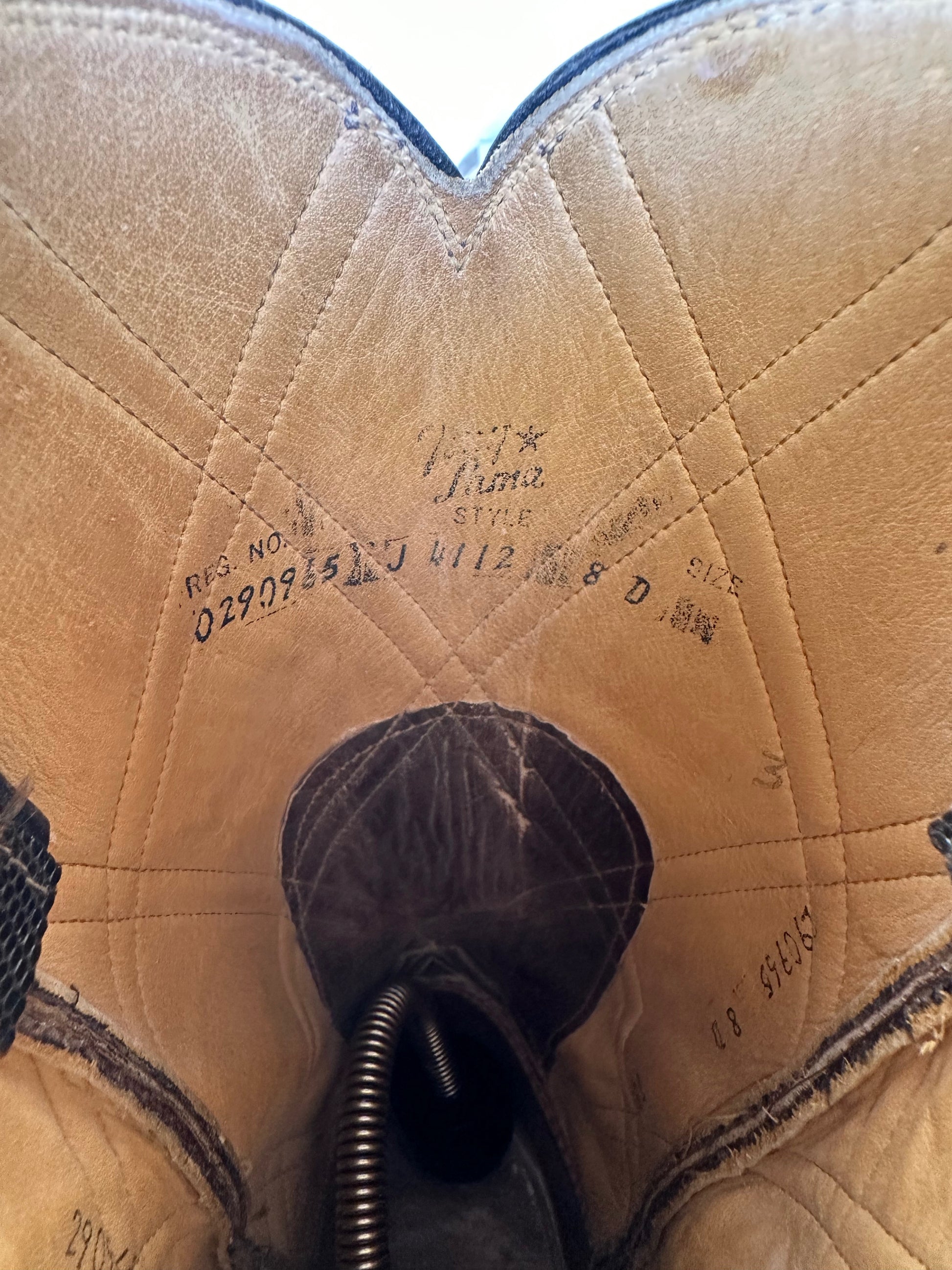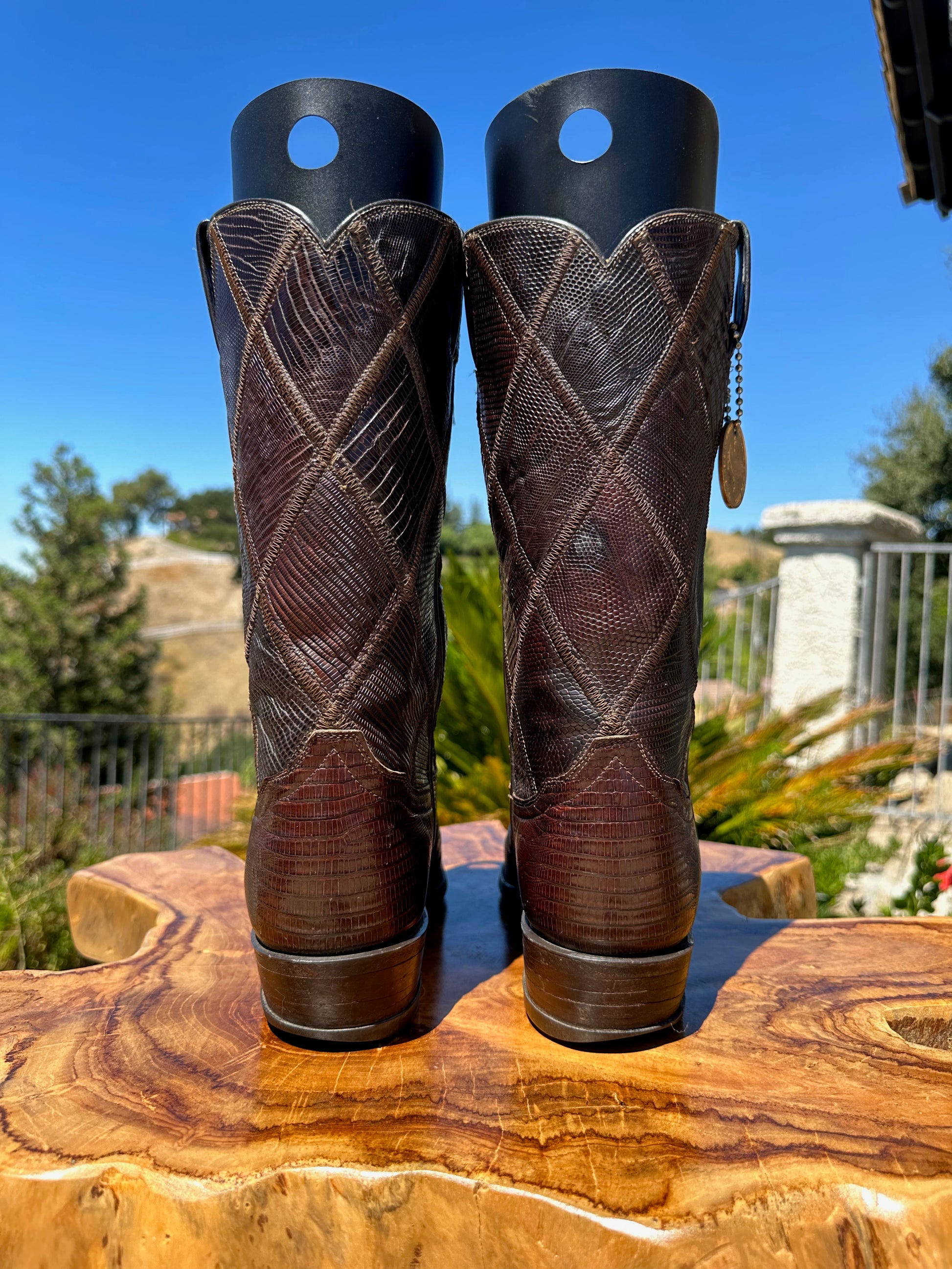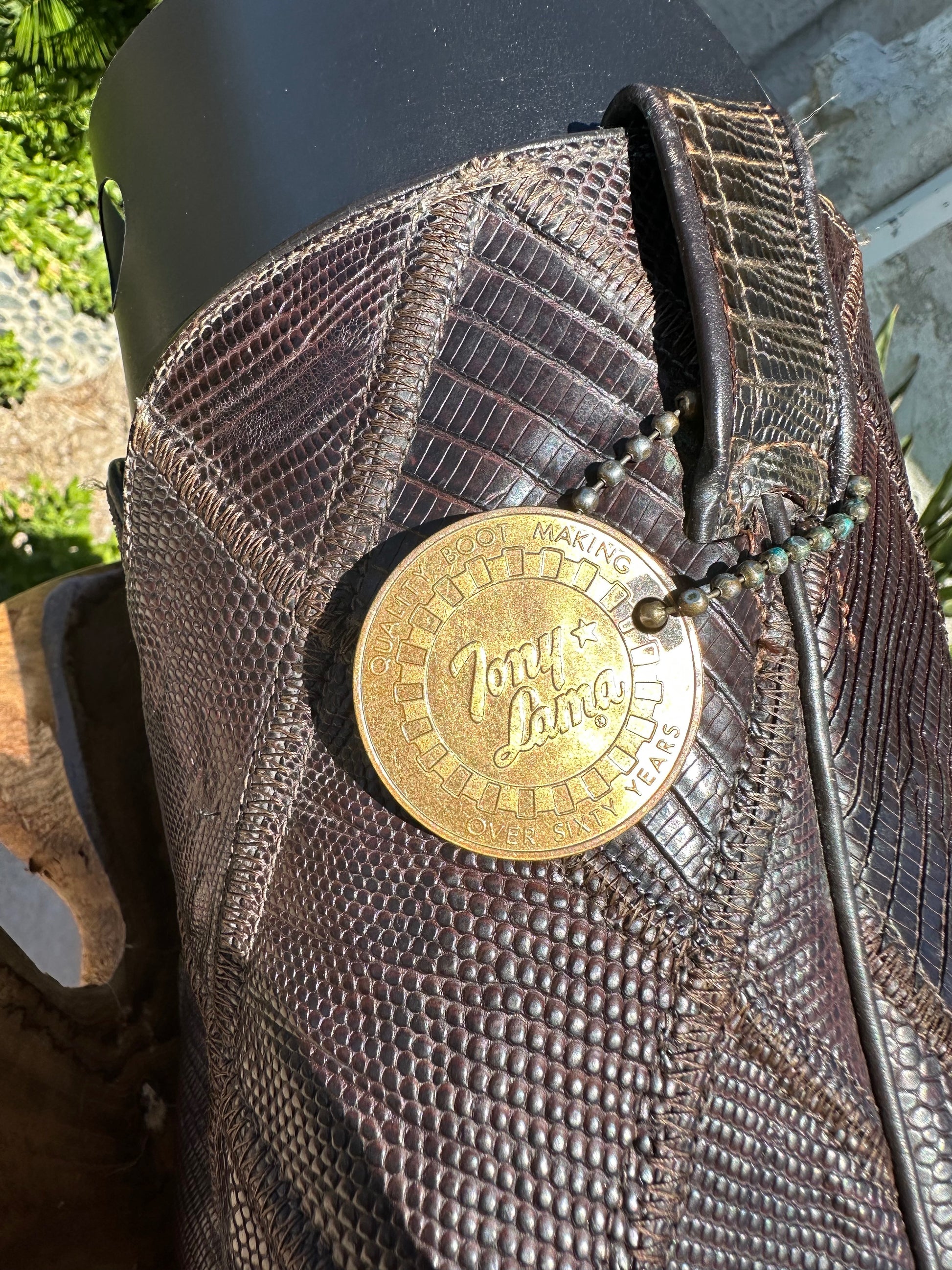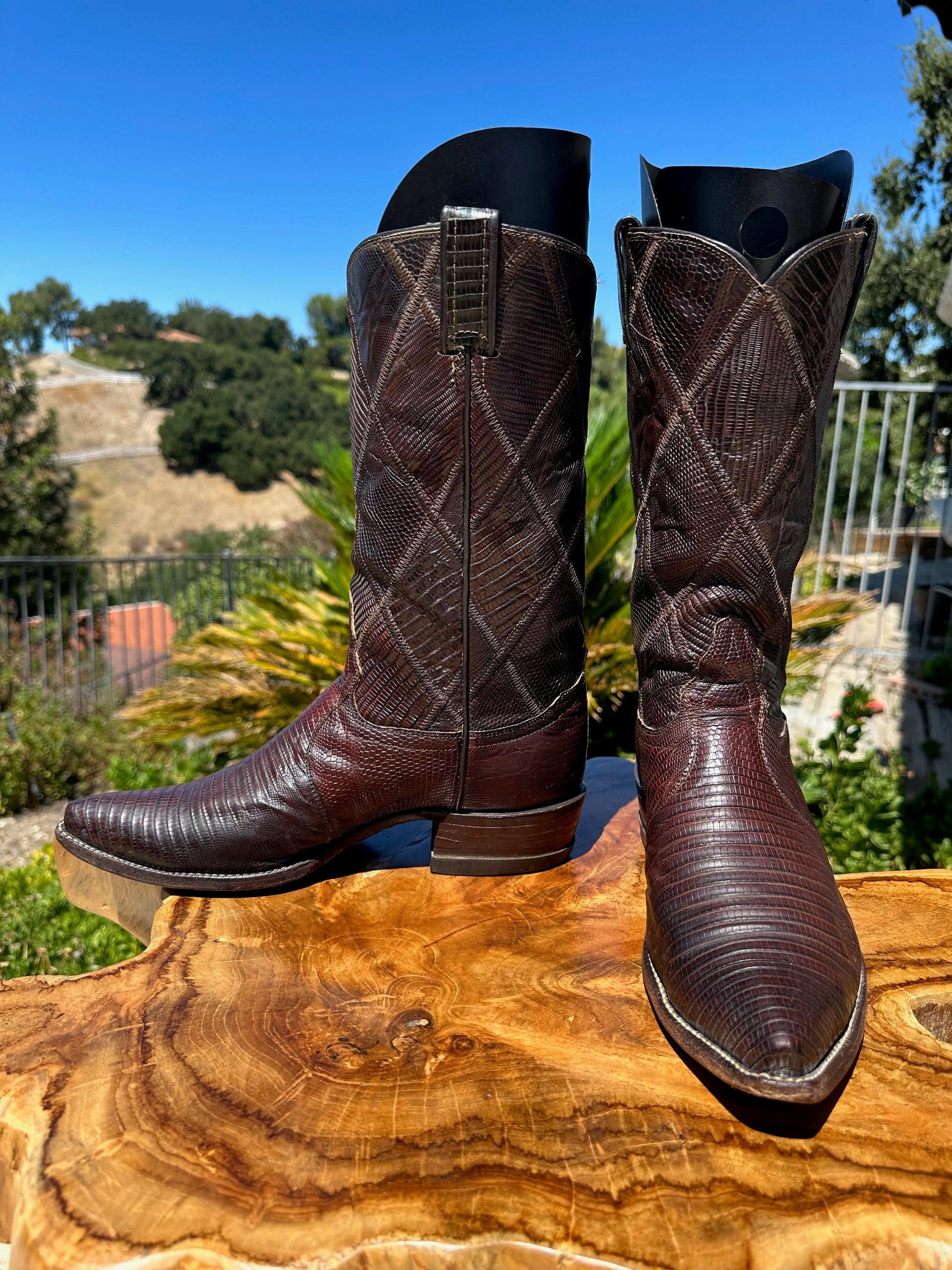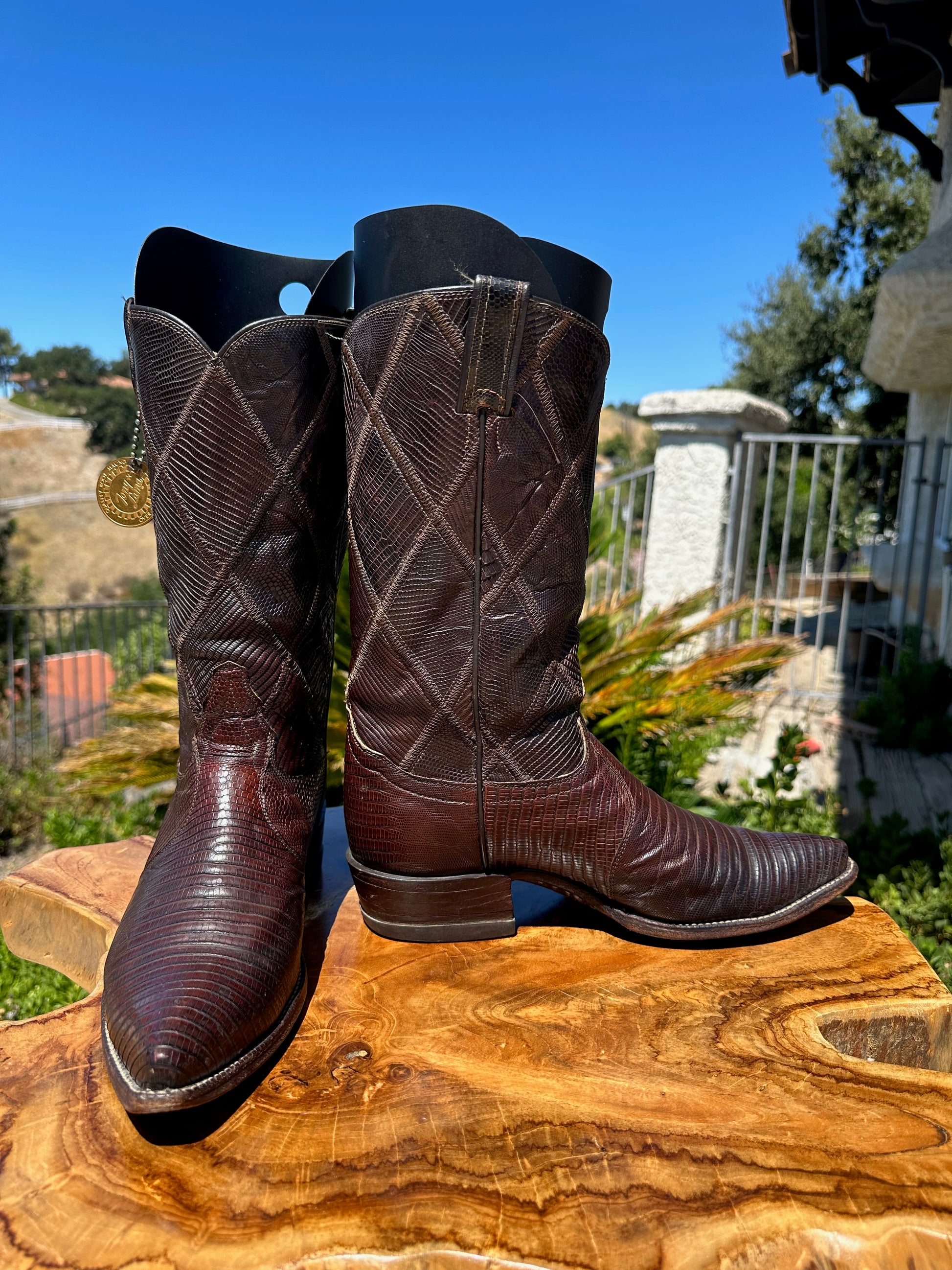Vintage Tony Lama Full Teju Lizard Cowboy Boots in size 8 D. Entire boot is Lizard top and bottom. Comes with medallion. 3 rows of pegs. Custom made in Texas. Vintage, rare, collectible cowboy boots.